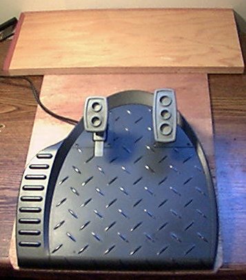 the ProjectAfter installing the heavier brake pedal spring, I noticed the pedal base had an increased tendency to slide on the floor during use. I found a scrap piece of 1/8" Mahagony door skin, and a short length of 3/4" Plywood from a trimmed shelf. I took measurements from the wall behind my monitor with my wheel and pedals in driving position, and assembled the base to match. I fastened them together with wood screws to form a T-shaped base for the pedals. The pedal base unit is secured to the 1/8" Mahagony with 4 Dry-wall screws into the bottom of the base. NOTE: Make sure you don't hit anything with the screws!