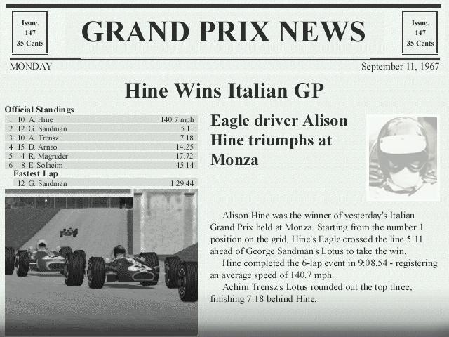 In these races, the drivers are often thousands of miles apart; in the newspaper at the right, you can see the names of drivers located in Norway, Spain, California, New Jersey, and New England! This capability means you can always find people to race with, any time of the day or night.